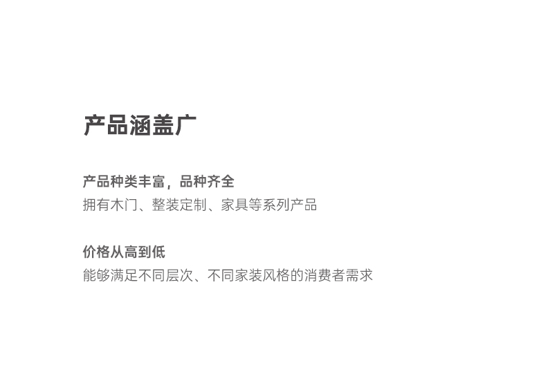 产品种类丰富,品种齐全,拥有木门、整装定制、家具等系列产品。