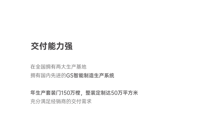 年生产套装门150万樘,整装定制达50万方,充分满足经销商的交付需求。